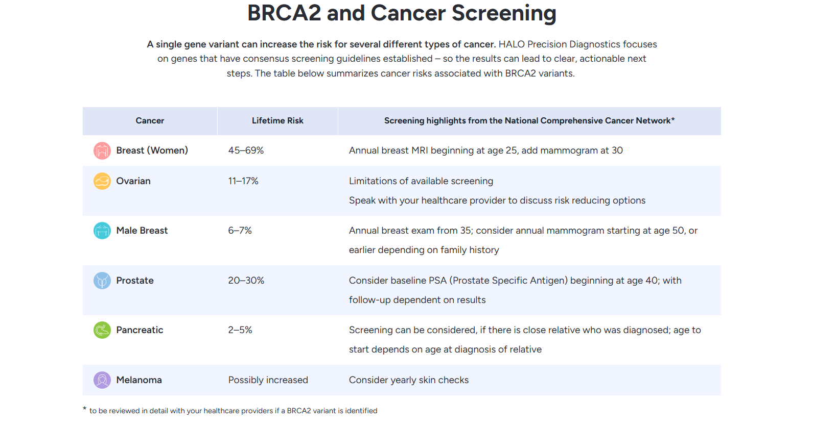 If you’re ready to learn more about your inherited cancer risk, or if your provider has recommended genetic testing, ask about the Halo Genetic Health PathWay.