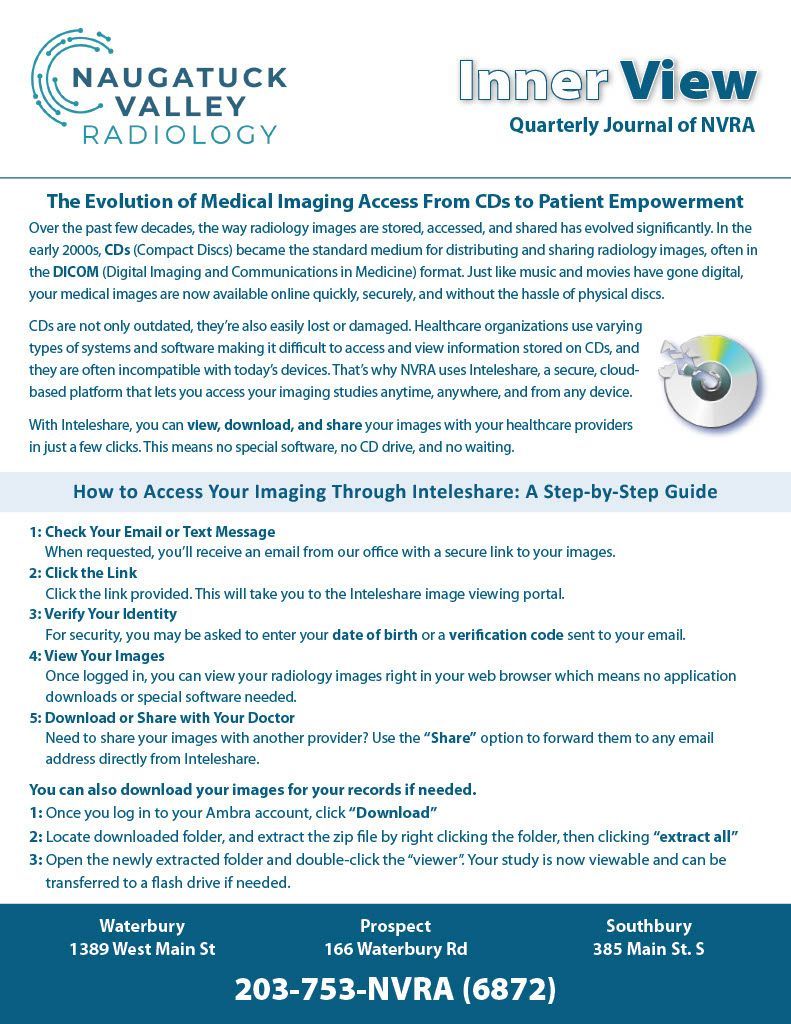 Learn how NVRA’s partnership with Inteleshare empowers patients to view, download, and share imaging studies securely from any device — no CDs, no waiting. Plus, discover how our online Patient Portal puts your imaging, reports, and appointment details right at your fingertips.