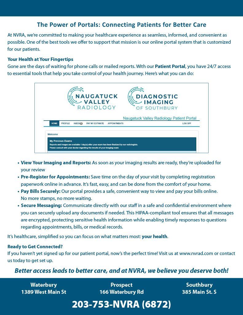 Welcome to the Fall 2025 edition of the NVRA Quarterly Newsletter! This issue explores how radiology innovation continues to simplify and strengthen patient care. From faster, more secure image sharing to streamlined online access, we’re highlighting tools designed to make your healthcare experience easier than ever.